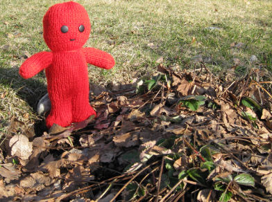 Hei igjen - har du en fin Langfredag? Som overskriften sier så skinner solen i Fredrikstad i dag...og vi har superdeilig vårtemperatur. Har såvidt tittet litt på hva som må gjøres i hagen i år..og som du ser så står Boba og titter på de nye jordbærskuddene som dukker opp under de gamle. Boba er et Gelebarn...strikket for etpar dager siden. Han ble mye større enn jeg trodde han skulle bli da jeg startet, men kjempefin. Det grønne strikketøyet du skimter på gårsdagens bilde er en bror eller søster av Boba - uvisst hvilket enda...for det vet man jo ikke før den er strikket ferdig og blitt adoptert av en av guttene. Det skal bli spennende å se. Lurer du på hva et Gelebarn er, sier du? Da eldstemann var liten viste tv2 dette som barnetv på morgenen...og det passet liksom at vi fikk det med oss. Youtube gir deg en liten titt.