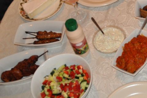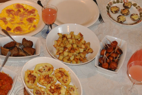 Fikk plutselig lyst på tapas her...og da er veien kort til å lage til et aldri så lite tapasbord også. Kanskje ikke den mest spennende varianten, men fyllt med sånt som vi liker; albondigas, kyllingspyd, oppblåste poteter, loaded potatoeskins, fyllt sopp, salat, brie, choritzo, bacon, tzatziki, eggeomelett og krydrede småkarbonader... Nam!