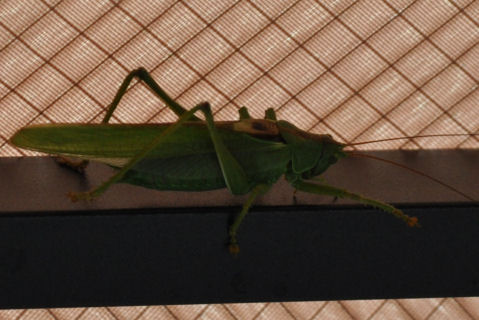 Her sitter man i fred og ro og spiser middag i hagen...og så hopper denne innom på besøk. Den klatret opp og ned langs stengene i teltet og visste visst ikke helt hvordan den skulle komme seg ut igjen. Det er noe fasinerende ved sånne store insekter...så vi valgte å hjelpe den ut fremfor å lage frityrrøre og smake på den...*fniser*