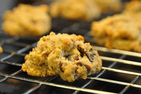 Gni smøret i mandelmelet, bland i egg og sjokolade. Settes som topper på bakeplate og stekes på 160 grader i 10-12 minutter.