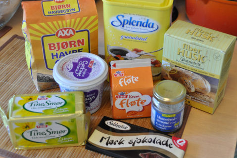 Når man lever LCHF (Low Carb High Fat) er det visse ting man "trenger" i skapene når man skal bake og kokkelere litt...Noen av de ser du her. Store havregryn, Splenda, fiberhusk, Cottage Cheese, fløte, smør (ekte saker!), JohannesBrødKjernemel (jbk)..og litt sukkerfri mørk sjokolade. Sistnevnte er kanskje ikke så viktig for helsa, men det er godt for sjelen. *fniser*