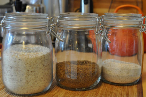 Vi tok en liten tur på Staples for å fylle opp lageret mitt med skolesaker i dag...sånt som blyanter, viskelær, farger og ny blyantspisser osv... sånne ting som er kjekke å ha når man tross alt har tre skolebarn i huset. Sekker har de alle tre, men vi må ut og handle nytt gymtøy...det er sånt som skjer når guttene bestemmer seg for å vokse nesten 5 cm i høyden og 1 skostørrelse opp. Jeg trodde ikke det hadde regnet såååå mye i sommer... hehehe Litt mer lavkarboprat; dere har sett litt av hva jeg har i skapene...og så tenkte jeg at jeg skulle dele et annet tips også. I krukkene på bildet har jeg (fra venstre) malt mandel, malt linfrø og malt havregryn. Det letter hverdagen å ha slikt ferdig til de gangene man trenger det. Malt mandel og linfrø brukes til microbrødskiver og malt havregryn brukes til frokostpannekaker. Når man har tatt seg litt tid i forkant til å male opp dette; mandler på kvern og linfrø/havregryn med stavmixer - blir det mye lettere å leve lavkarbo. Hvem savner vel tørre brødskiver når man får varme, nylagde skiver til å ha under et lass med pålegg?