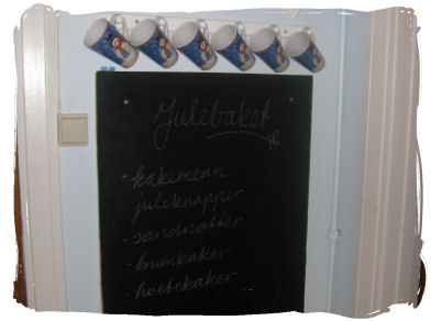 Middagstavlen på kjøkkenet har tatt ferie fra jobben som hjelper til middagsplanleggingen og blir istedet brukt til å liste opp hva vi har lyst til å bake til jul. Kakemenn og juleknapper er i boks. Hvetekaker og krumkaker står på planen for i morgen. Sandnøtter er best når de er ferske og blir derfor ikke bakt før om en uke eller noe sånt. I tillegg har jeg store planer om kanelmandler og karamell. Cluet er å lage det såpass sent at det fremdeles er noe igjen til julaften ergo må jeg drøye enda litt. Jeg har forresten blitt ferdig med den brune kjoletunikaen min. Nå mangler den bare etpar knapper så er den klar til å vises. Satser på at det blir såpass med daglys i morgen at det går ann å ta bilder av den. ~~~*~~~ 20 dager igjen...(hvor er bremsen?)