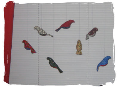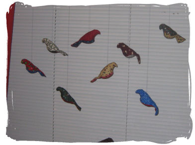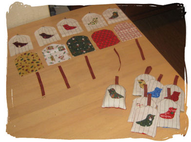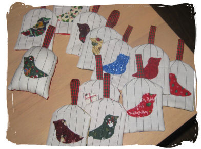 Jeg har sydd små fuglebur med fugler i... 12 stk. Fuglene er stitchet på og så fått symaskinsømmer over - som gitter i fuglebur. Fyllt med vatt og bånd til oppheng. ~~~*~~~ |