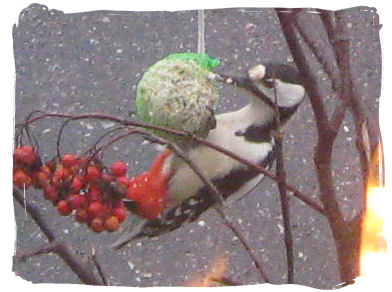 Vi har mye besøk i fugletreet vårt. Denne hakkespetten befinner seg der fra tid til annen og i dag klarte jeg å få tatt bilde av den mens den hang i en meisebolle. Ikke verdens beste bilde, men man kan da iallefall se at den henger der. Lille Hakke (ja, den må jo ha et navn...hehehe) er sort og hvit med et rødt felt nederst på magen. Den pleier å hakke i lysmasten utenfor her i sommerhalvåret, men nå har den altså lagt sin elsk på meiseboller. Bra vi har kjøpt en hel bøtte full med meiseboller sånn at vi stadigvekk kan henge opp nye. Vi er fremdeles plaget av at skjærene skremmer vekk småfugl og forsøker å spise opp all maten selv, men det virker som om de har mindre makt nå som flere småfugl har funnet veien til fugletreet vårt. Det blir spennende å se hvordan det blir utover vinteren. ~~~*~~~ 18 dager igjen...
