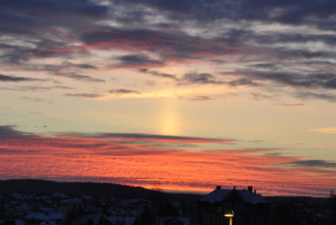 Måtte bare forsøke å få med den merkelige himmelen som var til morgenen i dag... men det blir jo aldri like bra på bilder som i virkeligheten. Solen kastet en klar stråle rett oppover og farget samtidig skyene med en klar rødfarge. Vakkert! ~~~*~~~ 11.februar