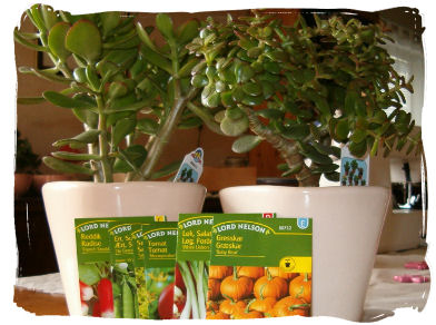 Jeg fikk gavekort fra Angelita til å bruke på Interflora...og jeg fallt for disse to pengetrærne i lyse potter. Disse blomstene har veldig sjeldent blomster, men OM de får de så sies det at man kommer til å bli veldig rik... hvor riktig det er vites ikke, men vi kan jo håpe at det stemmer. I tillegg til blomstene plukket jeg med noen poser med frø...og forhåpentligvis blir det masse fint å spise utover sensommeren og høsten. Tusen, tusen takk, Angelita!! *stor virtuell klem* (Jeg har også fått en stor smartpakke med stoff...og hva det har blitt og skal bli får du vite litt senere..) ~~~*~~~ Go green!