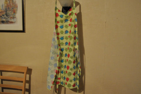 Ikke verdens beste bilde, men det viser i alle fall et forkle jeg sydde til eldstemann... han kom nemlig kvelden før og sa at han trengte forkle til "heimkunnskapen"... nå heter det ikke heimkunnskap lenger, men noe ala mat og helse ... Han er i alle fall rimelig spent på faget og det skulle jo bare mangle... har man planer om å bli kokk så har man planer om å bli kokk. Lærerne kommer nok til å merke at det er en som har vært en god del timer på kjøkkenet, ja...hehehe