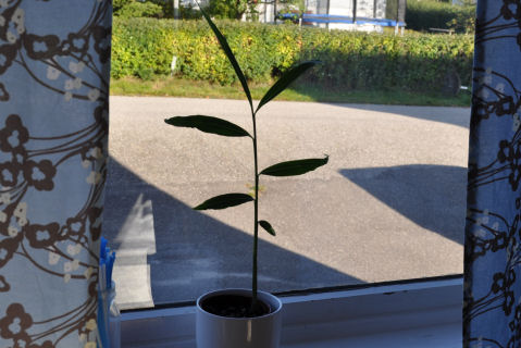Jeg viste bilde av denne ingefærplanten i forrige måned, men da var den bare en stilk med etpar blader på...Det er fremdeles bare en stilk med etpar blader på, men den har vokst seg godt over halvmeteren i skrivende stund. Det er på tide å enten a)kaste den ut av huset eller b)plante den om i en større blomsterpotte. Jeg får tenke litt på det...hehehe.