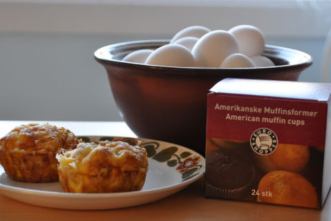 9 stk 9 egg 5 ss fløte litt salt løk/vårløk/gressløk e.l kjøtt av noe slag litt revet ost på toppen av hver muffins Stekes på 200 grader i ca 20 minutter.