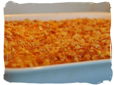 et halvt blomkålhode i makaronistore biter