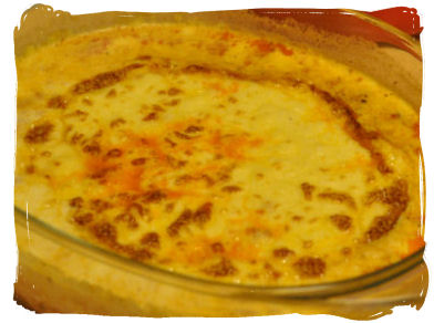 Stek kjøttdeigen og kok den inn med de hermetiske tomatene. Legg den i en ildfast form - lagvis med osteskivene og ostesausen. Ha revet ost på toppen og