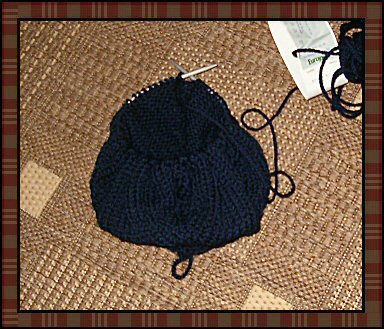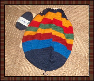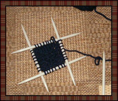 Her er den spede begynnelsen. Litt knot å jobbe med strømpepinner, men det går da på et vis. Gleder meg til å gå over til rundpinner. Veskens bunn strikkes på strømpepinne #5 og i Artic-garn fra Europris. Jeg har valgt mørkeblå til bunnen av vesken. Resten av vesken kommer til å bli stripete i alle slags farger i og med at jeg bruker restegarn. Det skal legges til at det ikke er tatt så veldig mye av hvert nøste...så det blir vel greie striper, tenker jeg. | |