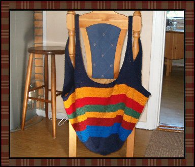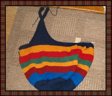Nå er jeg snart ferdig med selve veske"kroppen". Jeg vet ikke hvor dyp jeg vil ha den...så jeg tenker hardt nå. | |